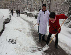 2018年的初雪落下,银装满地,大人、孩子都沉浸在这场雪带来的喜悦中。“湿滑的地面会不会影响患者就诊?医务人员取药、送物会不会滑倒?”市第八医院领导从瑞雪飘下,就惦记起了患者和医院职工。1月4日一大早,院长郭雅玲带领院领导班子成员和全院行政职能科室、保卫、后勤职工和保洁人员,对全院主要道路和门诊楼、住院部的出入口、家属区进行了清扫,方便患者和家属出行。