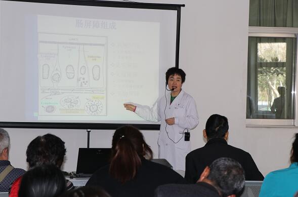 下午14:30,中西医结合科主任杨璞叶受邀在门诊大厅为到会的50多名患者、家属和群众,讲解了题为《筑“肠”城 护肝脏 促进康》的讲座,杨主任从肠道的功能入手,详细介绍了肝脏和肠道的关系,为什么养肠和护肝息息相关,怎么样才能养好肝和肠等方面的知识,特别是在讲到如何通过一日三餐搭配做到养肠护肝,哪些穴位可以帮助我们养肠护肝的问题时,现场观众和杨主任展开了热烈的互动。“大便不正常是不是说肝脏也不好?”“为啥人情绪不好会影响肠道黏膜?”“这些养肠护肝的穴位要怎么按?”面对这些问题,杨主任用幽默的语言,通俗易懂的回答了大家的提问。
