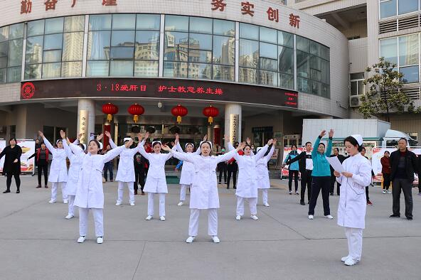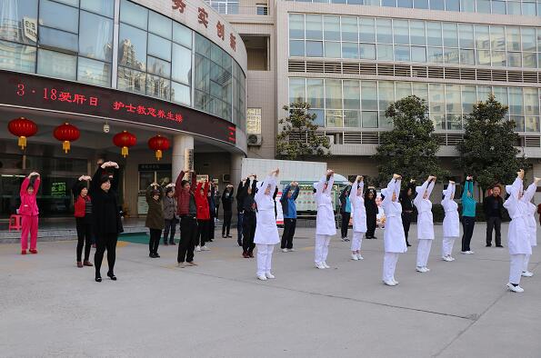 自行研发的一套肝脏养生操演示,养生操以中医理论为基础,在总结医院肝病诊疗护理经验的同时,融入了脉络学知识。养生操共分十式,以任督二脉,手足三阴、三阳经为主体,通过中医“拍、搓、揉、压”等手法,辅以不同的动作,沟通表里、内外、上下,从而达到保健、养生祛病的目的。神采奕奕的护士们在医院门诊楼前,一边演示肝脏养生操一边为大家讲解肝脏养生操涉及的经络和意义。许多就诊患者、家属,甚至过路的群众都自觉地加入到队伍中,就连来医院见习的西安医学院的医学生都跟着一起做了起来。