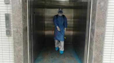 27日,市第八医院消毒员在认真的打扫电梯及相关通道的卫生并对其进行了消毒。