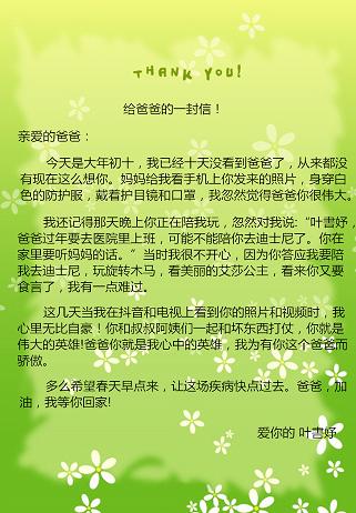“我已经十天没看到爸爸了,从来都没有现在这么想你……身穿白色的防护服,戴着护目镜和口罩,我忽然觉得爸爸你很伟大。”这是7岁小姑娘叶書妤写给爸爸的信。而她的爸爸此时正在和新型冠状病毒“斗争”,他就是老虎机平台 放射科医师叶东廷。