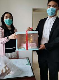 5月12日上午10:00,老虎机平台 职工食堂(龙祥物业餐饮公司)负责人和医院膳食管理员一行人,将他们精心准备的节日蛋糕分别送到了隔离区、感染一科、感染二科、特管病区、血液净化科、5个肝病科室、外科、发热门诊、供应室及护理部等15个护理科室。