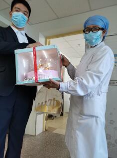 当他们提着蛋糕出现在护士站时,护士长和护士姐妹们脸上洋溢着惊喜的表情,龙祥公司医院职工食堂负责人表达了他们的祝福:今天是5.12国际护士节,祝你们节日快乐! 对疫情期间白衣天使的逆行表示由衷的感谢并将蛋糕送到护士长手中。为了记录这一温暖的时刻,大家拿出了手机拍照留影,随后又匆匆走进了病房。