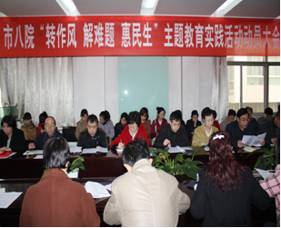委员会关于印发开展转作风、解难题、惠民生主题教育实践活动实施方案》,对我院主题实践活动做了安排部署。随后,院党委书记陈惠霞做了动员讲话,她强调全院广大党员干部要充分认识开展主题教育实践活动的重大意义;要明确目标任务,着实推进活动在我院深入开展;要强化组织领导,确保活动取得实实在在的成效。她希望全院中层要牢固树立服务意识,改进作风,了解患者需求,倾听职工呼声,积极主动解民忧,深入细致解民怨,满清热忱解民困,不断提高群众满意度。号召院领导干部以身作则,深入临床一线进行调查研究,把办实事、解难题作为贯穿活动过程的主线,通过“转作风、解难题、惠民生”来提高医院整体服务水平、改过服务作风、促进医患和谐。