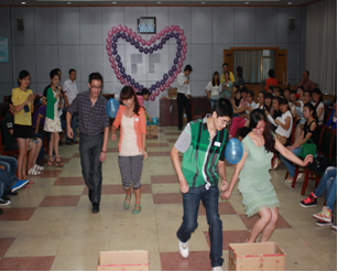 在大家对彼此都有了基本了解之后,进入了最精彩的游戏环节。由齐心协力、我的地盘我做主、爱要大声说出来、你的身边有我四个游戏组成。其中爱要大声说出来是赢得大家掌声和笑声最多的环节,由参加活动的领导抽出男女各四名,一男一女组成一组,依次表演规定内容的爱情情景剧。游戏开始前,主持人邀请了39所杜浩维书记和我院郑菊贤书记一起,为大家进行了示范,两位书记通过幽默生动的对话,丰富到位的表情和动作,将一对恋爱中的青年男女刻画的惟妙惟肖,引得台下年轻人阵阵的笑声和热烈的掌声。